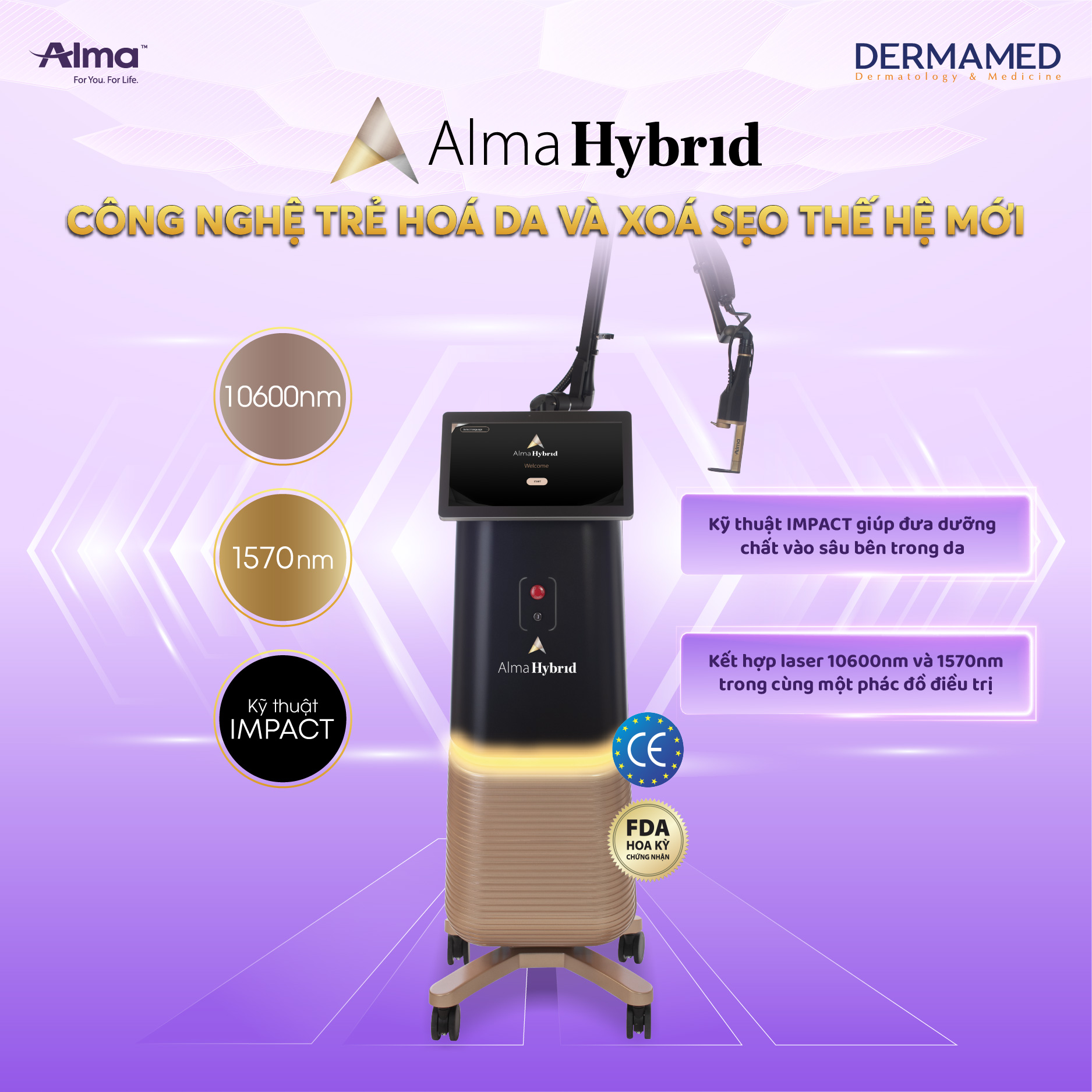 Alma Hybrid – Mang đến một sự kết hợp độc đáo của 3 năng lượng mạnh mẽ, Alma Hybrid đặt ra một tiêu chuẩn mới trong trẻ hóa da, tái tạo bề mặt da và điều trị sẹo. Với chiến thuật laser kép, mang đến đầy đủ các bước sóng bóc tách và không bóc tách tùy chỉnh hóa, Alma Hybrid cung cấp những giải pháp không giới hạn và kiểm soát tối ưu vượt trội hơn laser phân đoạn tiêu chuẩn,